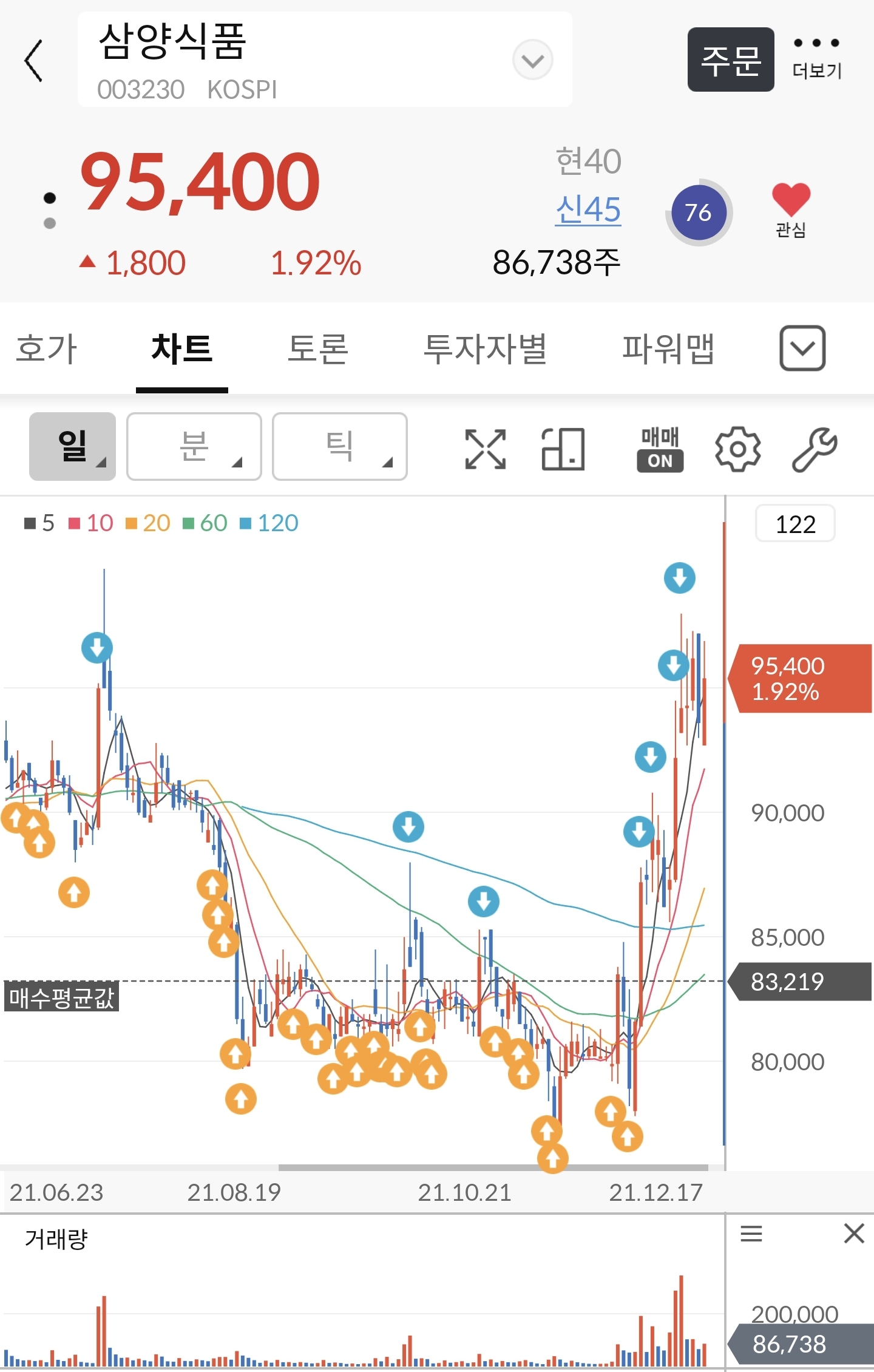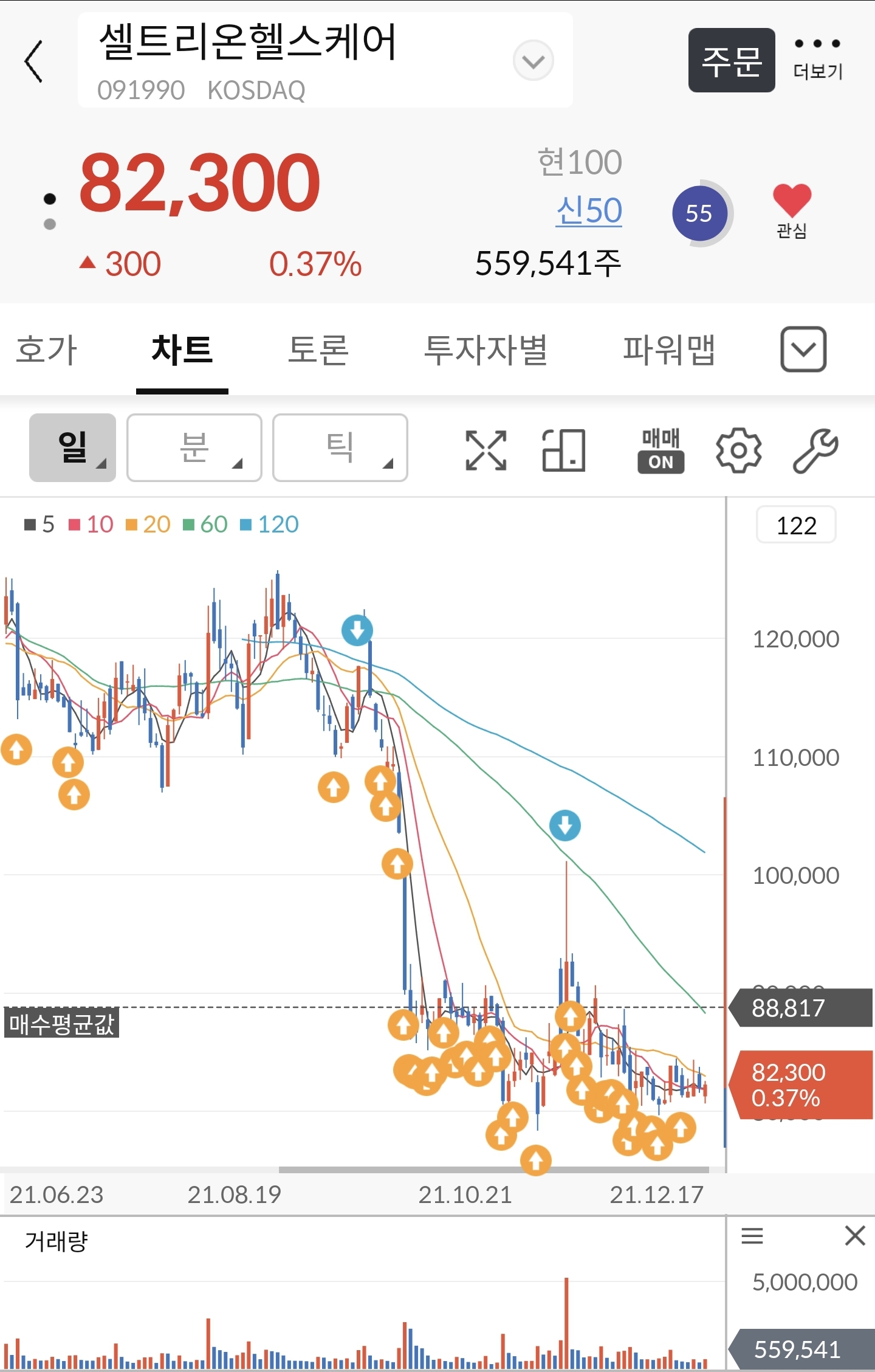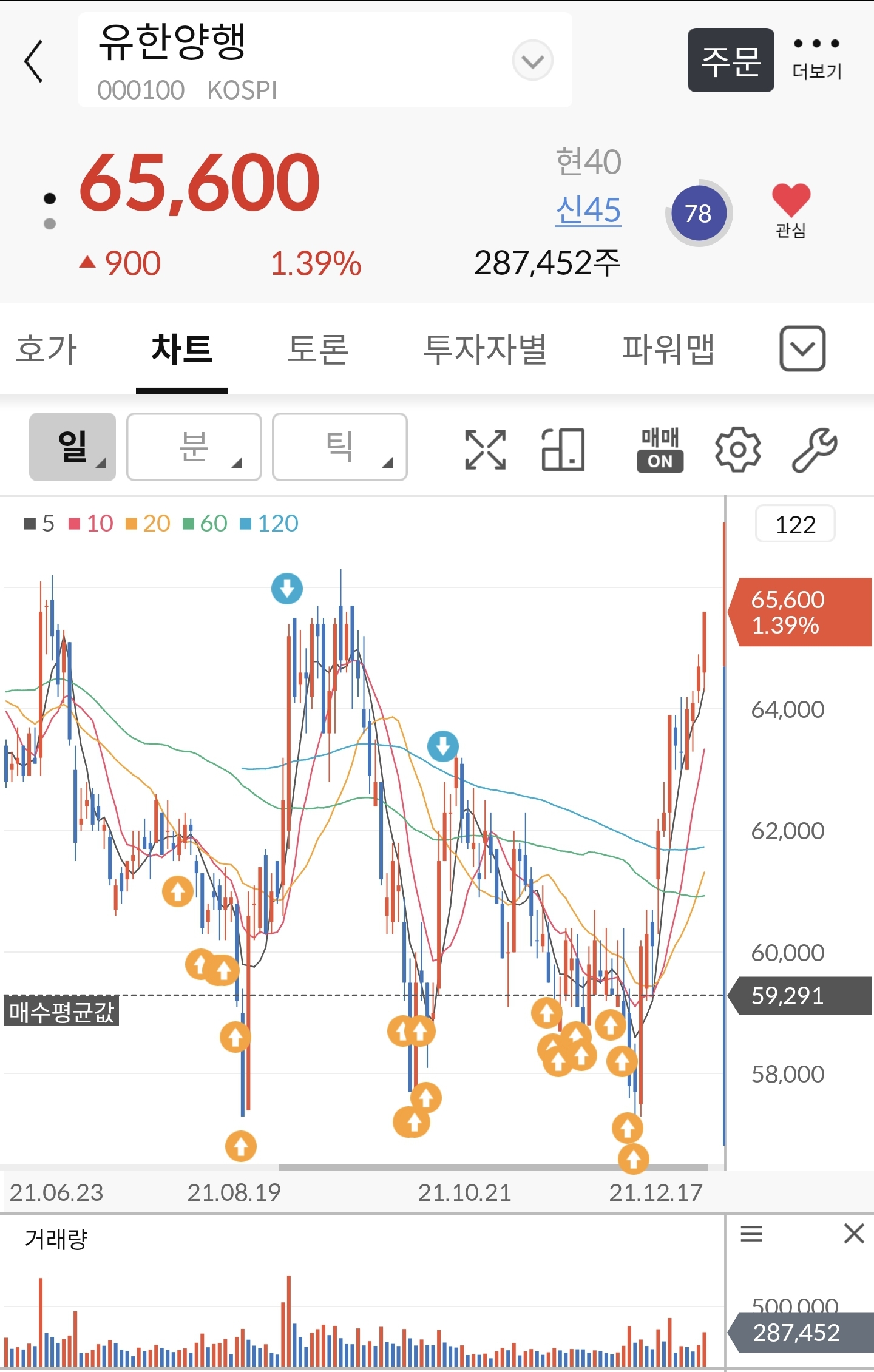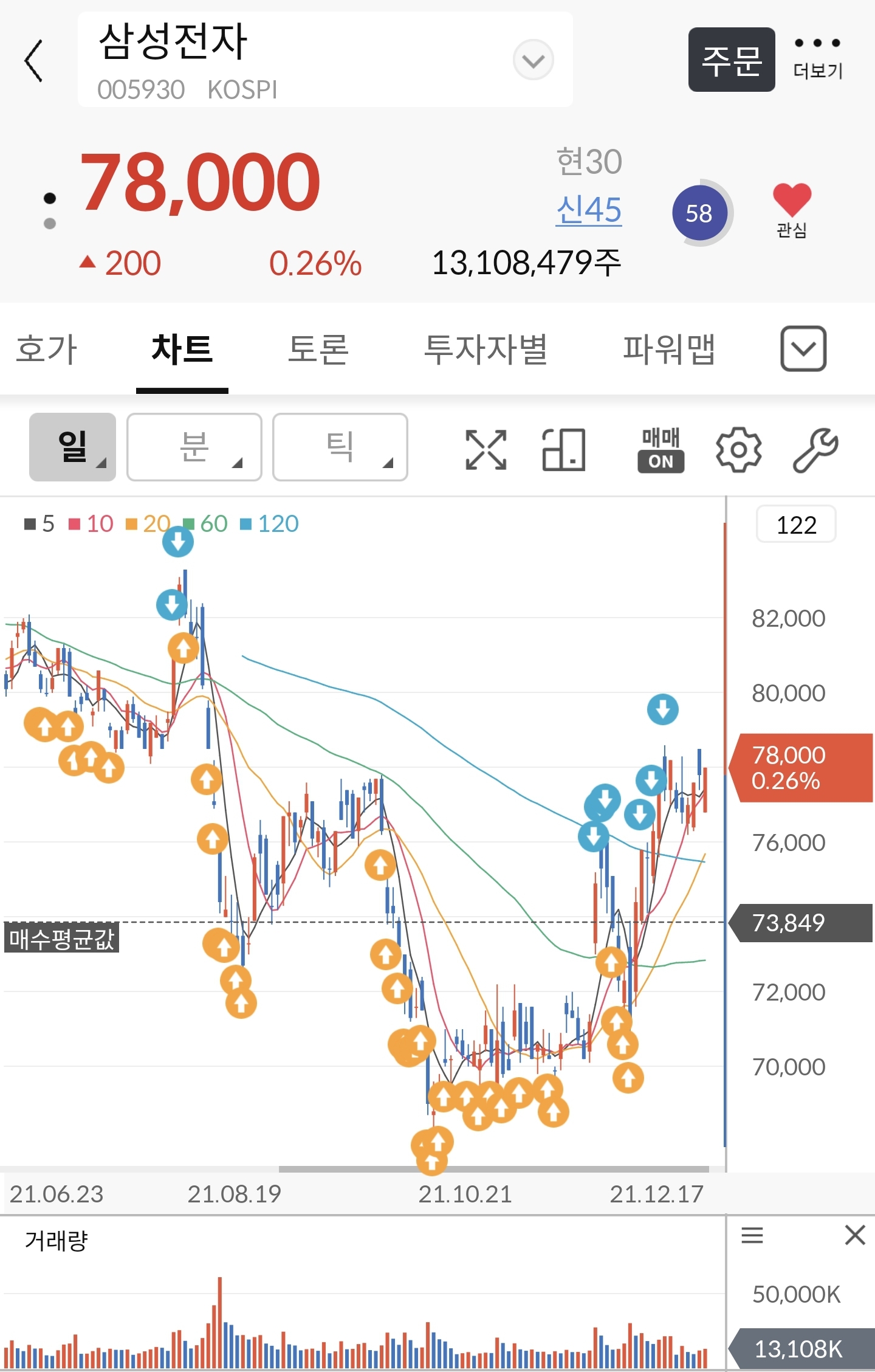 *아래 차트에 까만 선은 저의 평단, 노란색은 매수 기록, 파란색은 매도 기록. 매도는 일부만 했어요.